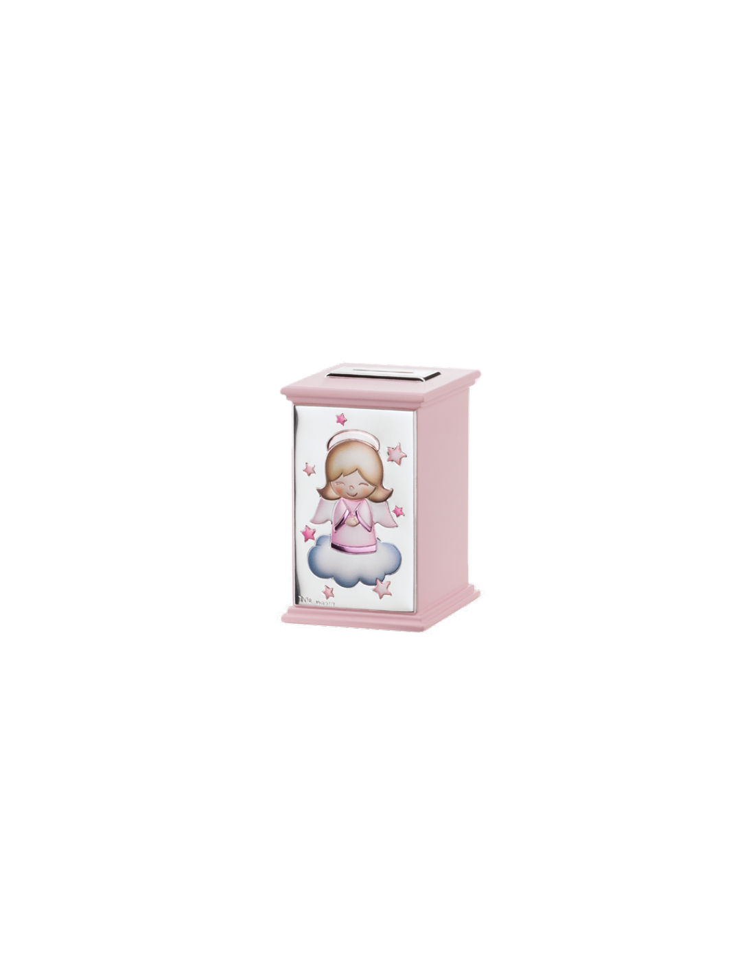 Salvadanaio rosa Carillon in legno con placca in argento laminato con angelo.